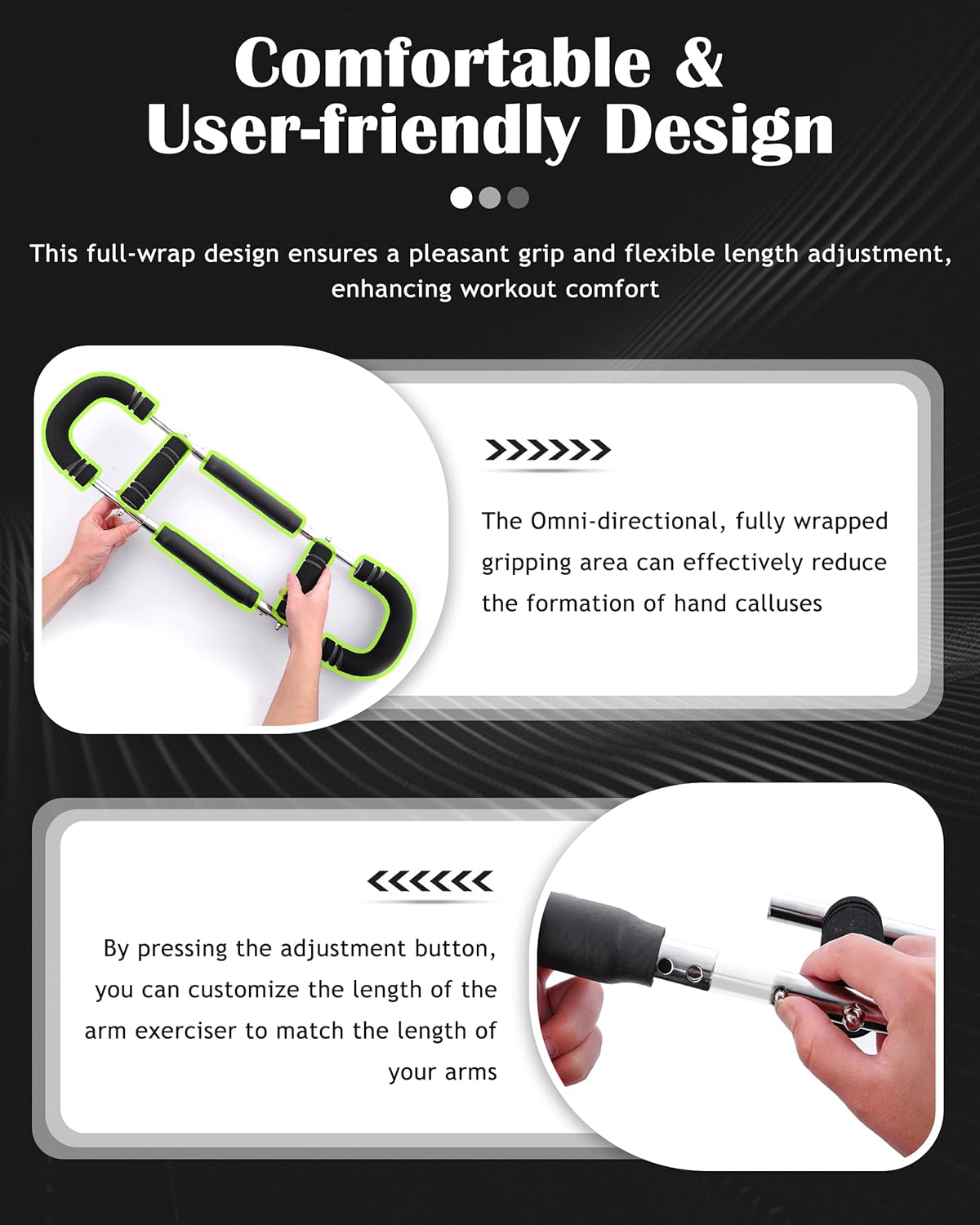 Customizable Resistance Levels: Personalize your workouts by adjusting the distance and grip width of the spring bar to suit your fitness level and goals. This feature allows you to progress at your own pace, making it suitable for beginners and seasoned athletes alike.