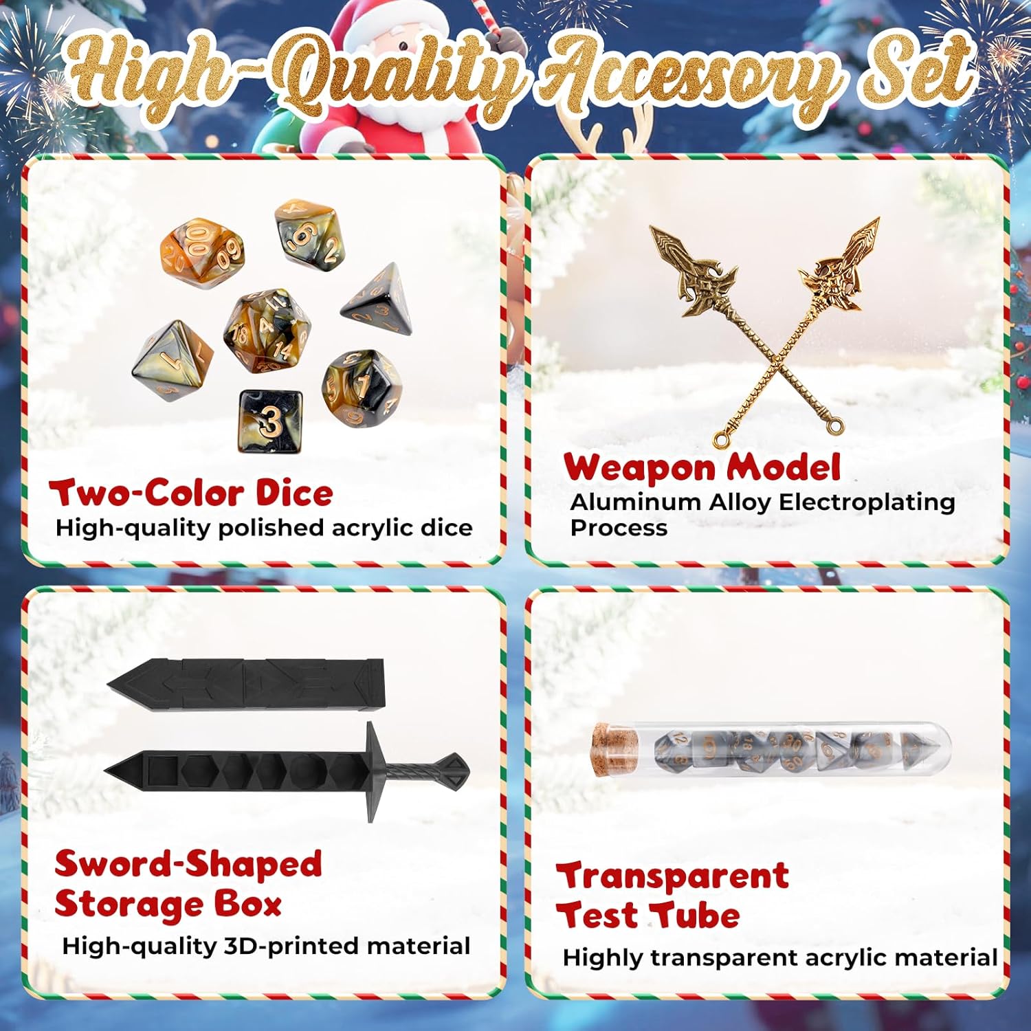 - 24-Day Countdown: Experience the excitement of a 24-day countdown that reveals a stunning collection of 28 polyhedral dice, 2 decorative swords, a sword-shaped storage box, and a glass tube, making it a must-have collectible for any dice lover.