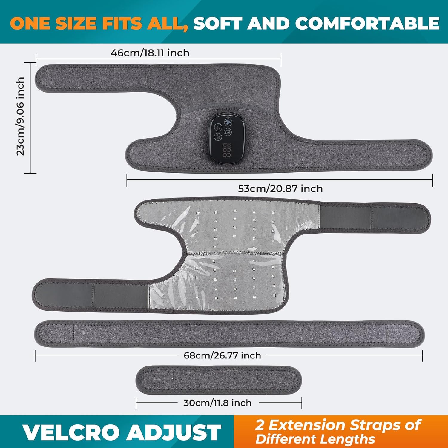 1. Comprehensive Body Care: Equipped with 44 red light beads, this support emits 660nm and 850nm wavelengths, merging red light therapy with heat therapy for holistic wellness. 2. Versatile Use: Perfect for treating shoulders, knees, and elbows. Ideal for beauty-conscious individuals, office workers, fitness lovers, seniors, and more. 3. Advanced Red Light Therapy: Features three modes (660nm/850nm/Full Spectrum) and four intensity levels (L1-L2-L3-L4) to effectively reduce pain, enhance wound healing, decrease inflammation, combat muscle fatigue, and improve skin health. 4. Effective Heat Therapy: Offers four temperature settings (45°C/50°C/55°C/60°C) to promote blood circulation, ease muscle soreness, relax tight muscles, and alleviate stress. 5. Smart Timing Options: Choose from three treatment durations (20min/30min/45min) for personalized therapy without the worry of overuse. 6. Convenient USB Charging: Features a built-in 5000mAh rechargeable battery for extended use, allowing for cordless physiotherapy wherever you need it. 7. User-Friendly Digital Controller: Designed with an exclusive touchscreen interface, this digital display shows dual temperature settings (°C/°F), real-time battery status, heating temperature, and timer, with added anti-misoperation features for enhanced usability.