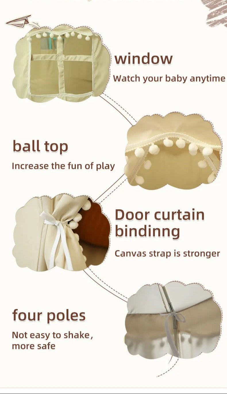 Crafted from premium, durable fabric with a soft plush finish, this play tent guarantees a safe and inviting environment for your little ones. Its charming aesthetic, available in soothing colors like beige, grey, and pink, fits seamlessly into any nursery, playroom, or outdoor space. The tent's foldable design allows for quick setup and easy storage, making it perfect for spontaneous indoor fun or outdoor escapades.